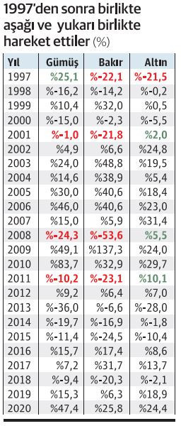 Geçmişteki verilere bakıldığında iki metalin fiyat değişim hareketlerinin benzerliği daha net görülüyor. Stock & Gold Market Report’un yazarı Geoffrey Caveney tarafından yapılan analize göre, 1900-2020 arasındaki 120 yıl boyunca her üç yılın ikisinde gümüş ve bakır aynı yönde hareket ediyor. 1980'lerde ve 90'ların başında gümüşün altınla daha yakın bir yıllık fiyat değişimi korelasyonu varken, 1997’den sonra gümüş ve bakır korelasyonu görülür şekilde artıyor. 1997, gümüş fiyatı ve bakır fiyatının aynı yönde hareket etmediği son yılken, 1998'den 2020'ye kadar gümüş ve bakır fiyatlarının her yıl birlikte düştüğü ya da çıktığı görülüyor.